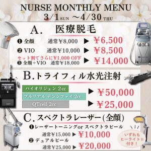 3・4月限定で、ナース施術メニューを特別価格でご案内します。