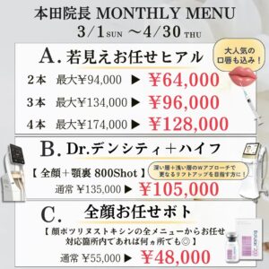 院長施術、3・4月限定プライスメニュー🍡